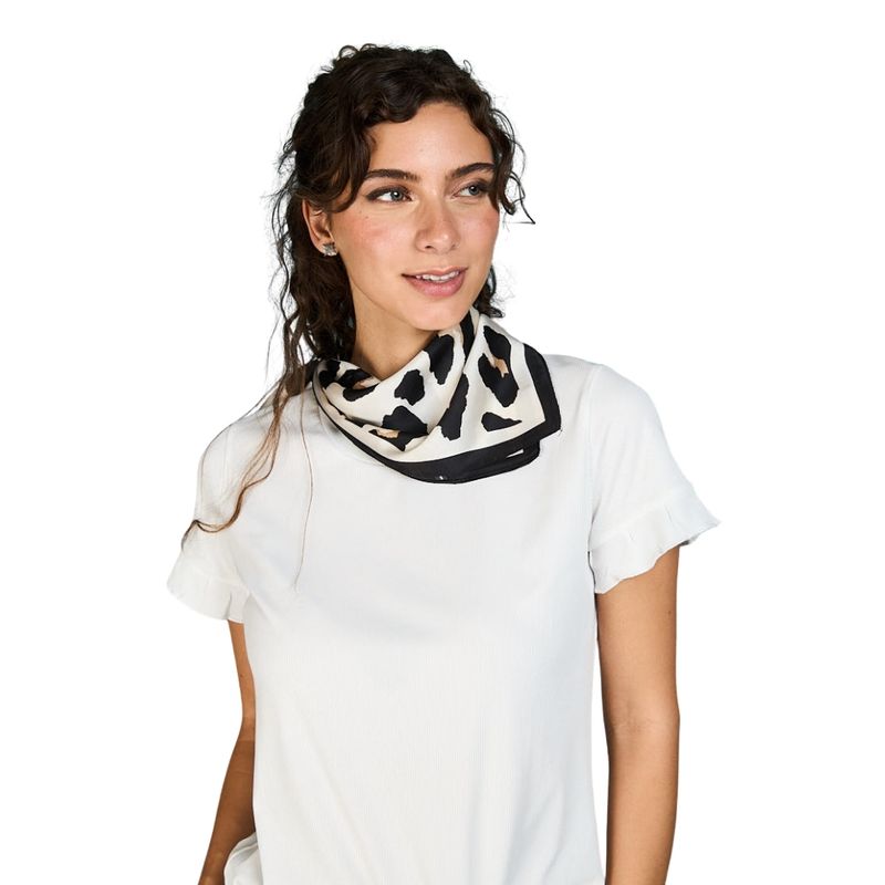 Exclusivo pañuelo cuadrado de 70cm x 70cm de la marca Eclipse, perfecto para la mujer moderna que busca un accesorio elegante y versátil. El modelo Leonor presenta un sofisticado estampado animal print de leopardo en una combinación atemporal de blanco y negro, realzado con un distintivo borde negro que define y enmarca el diseño.