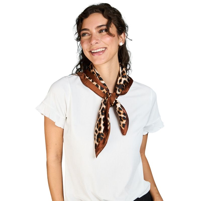 Recomendaciones de Combinación: Este versátil pañuelo animal print es ideal para elevar cualquier outfit. Combinalo con prendas en colores sólidos como negro, marrón, beige o crema para que el estampado sea el protagonista. Funciona perfectamente con blazers negros para looks de oficina, sweaters en tonos neutros para ocasiones casuales, o vestidos lisos para eventos especiales. Usalo como bufanda elegante, bandana moderna, o accesorio decorativo en tu cartera. Para el calzado, combina excelente con champion en negro, marrón o nude que complementen los tonos del estampado.