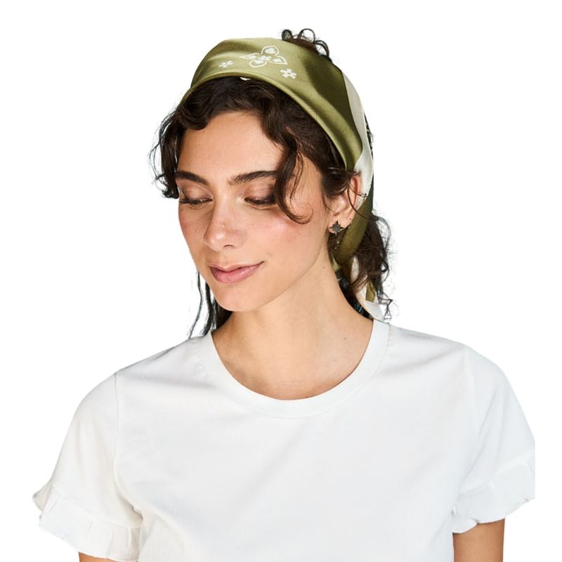 Recomendaciones de Combinación: Este pañuelo floral verde es el complemento perfecto para outfits bohemios y casuales. Combinalo con blusas en lino blanco, camisetas básicas en crema o beige, y vestidos largos en tonos tierra para crear un conjunto armonioso. Los colores que mejor complementan el verde incluyen amarillo mostaza, marrón claro, rosa pálido y blanco marfil. Para un estilo más urbano, usalo con jeans de tiro alto, tops básicos y chaquetas de denim. El calzado ideal son champion blancos, verdes o en tonos nude que mantengan la naturalidad del look boho.