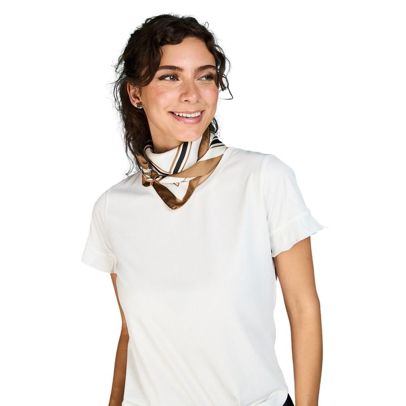 Recomendaciones de Combinación: Este versátil pañuelo se adapta perfectamente a múltiples estilos. Combinalo con blusas lisas en colores neutros como blanco, beige o negro para crear un contraste elegante. También funciona excelentemente con vestidos monocromáticos o conjuntos casuales. Podés usarlo alrededor del cuello para un look clásico, como bandana para un estilo más relajado, o atado al bolso como accesorio decorativo. Combina ideal con champion en tonos nude, marrón o negro para completar el conjunto.