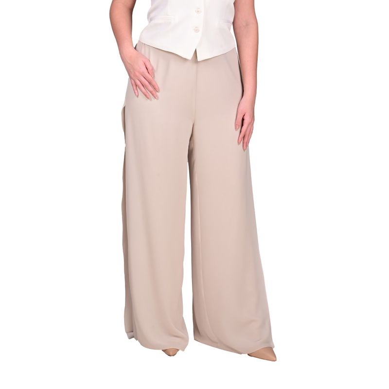 El pantalón presenta aberturas o cortes en los costados de ambas piernas, desde la cadera hasta el tobillo, que aportan dinamismo, movimiento y un toque contemporáneo. La cintura elástica en la parte trasera ofrece un ajuste cómodo y flexible, facilitando el uso diario y garantizando confort durante todo el día.