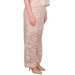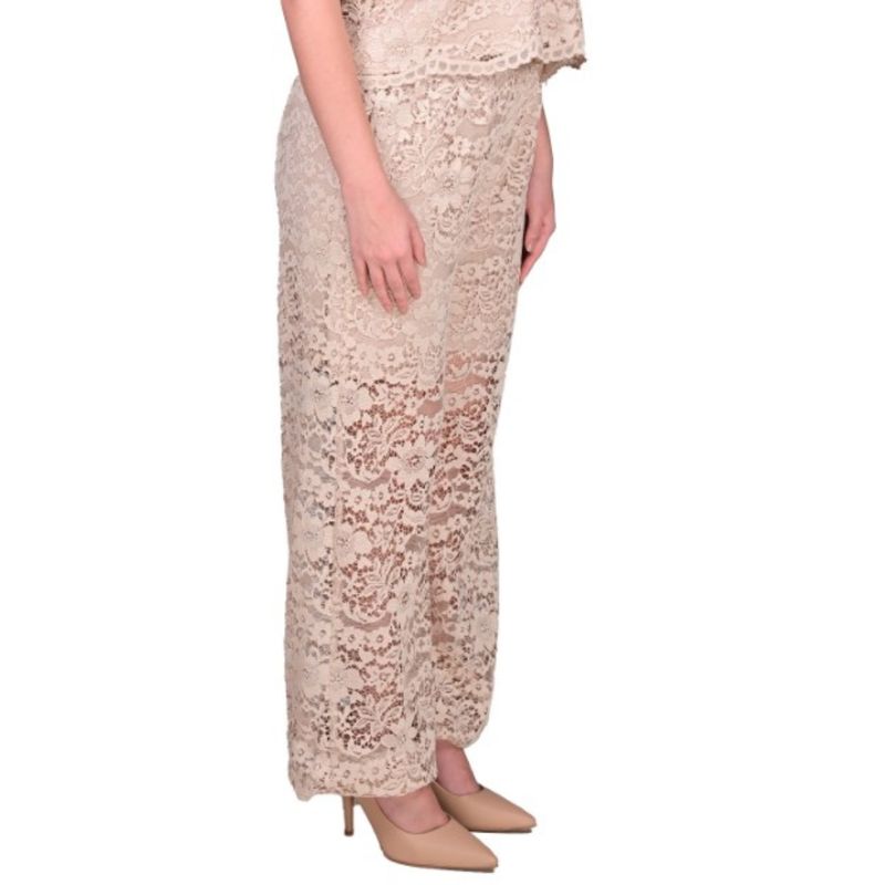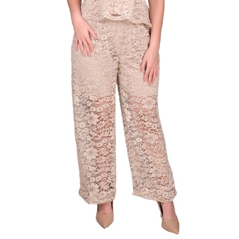 El pantalón está confeccionado en encaje floral que cubre toda la superficie, ofreciendo un acabado elegante y femenino. Cuenta con un forro interior opaco que llega hasta la mitad del muslo, dejando la parte inferior de la pierna semitransparente, creando un efecto delicado y sofisticado. La pierna recta y ancha permite comodidad y libertad de movimiento, mientras que la cintura ajustable garantiza un ajuste perfecto al cuerpo.