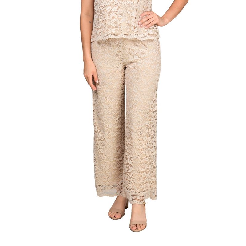 Este pantalón de mujer en color beige combina elegancia y sofisticación con un diseño estilo palazzo de corte ancho que realza la silueta y aporta movimiento. Confeccionado totalmente en encaje delicado, cuenta con un forro interior corto que garantiza comodidad y discreción, mientras mantiene la transparencia característica del encaje en las piernas. Ideal para lucir en eventos especiales, fiestas o reuniones donde se busque un look femenino y distinguido.