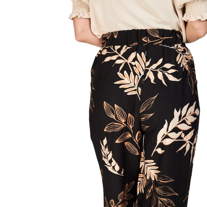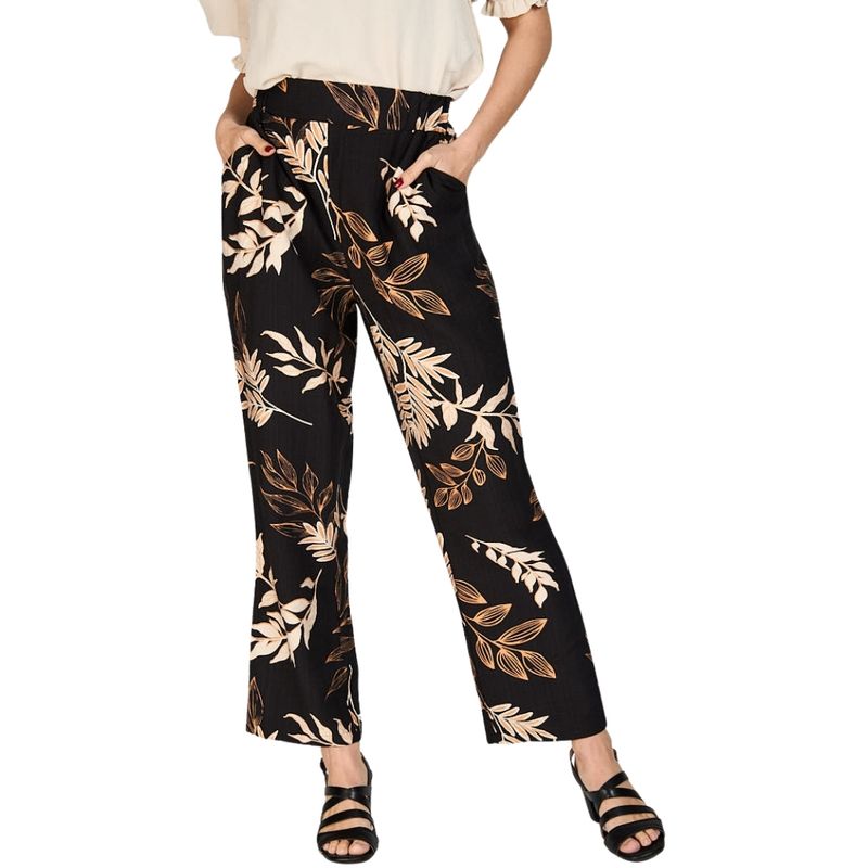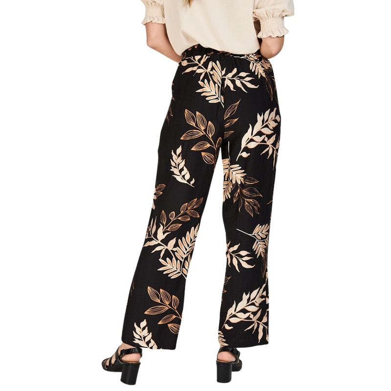 Características principales: Este pantalón presenta un sofisticado estampado tropical sobre fondo negro profundo, decorado con hojas y ramas en tonos beige, crema y dorado. El diseño incluye diversos elementos botánicos como hojas de palma, ramas con hojas alargadas y detalles vegetales estilizados que aportan un toque natural y refinado.