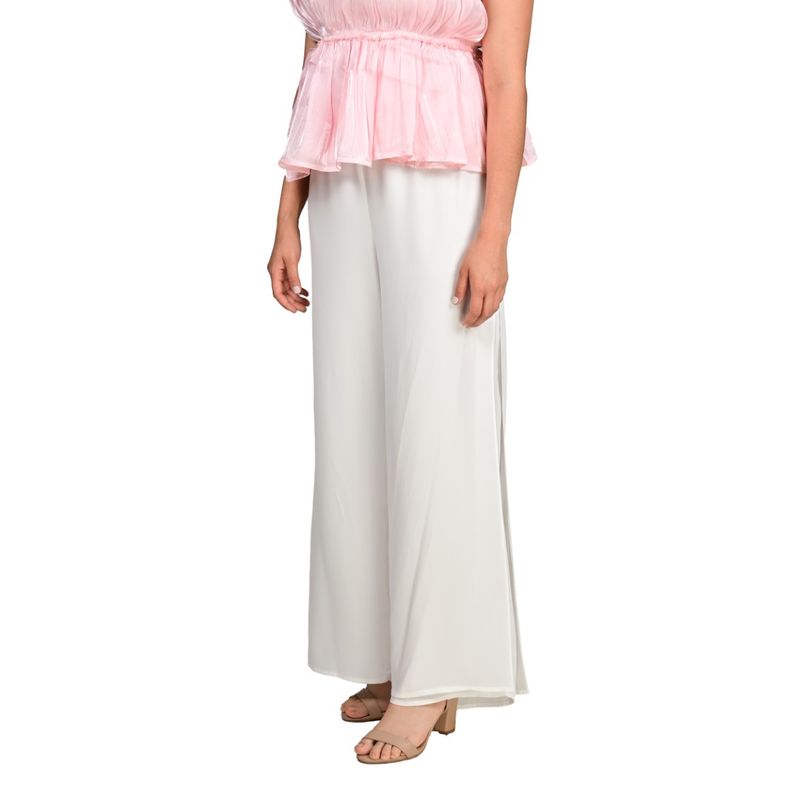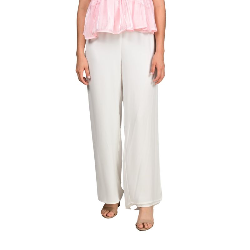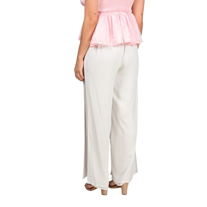 Este pantalón estilo palazzo en color marfil destaca por su diseño femenino y elegante, con corte ancho y tiro alto que realza la silueta y aporta comodidad. Su confección en gasa ligera y fluida permite un movimiento natural y fresco, ideal para climas cálidos o para eventos diurnos. El estilo palazzo doble añade sofisticación y volumen equilibrado, convirtiéndolo en una pieza versátil para combinaciones formales o casuales.