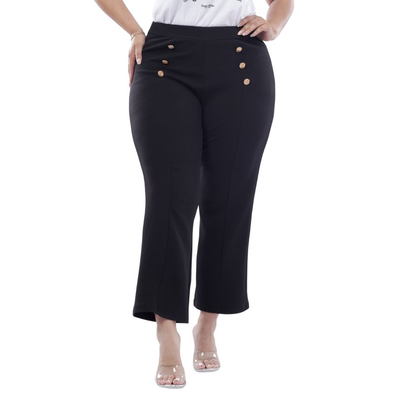 Descubre la elegancia atemporal con el Pantalón Negro De Vestir Con Botones Dorados de Susan Miller, pensado para mujeres que buscan un look sofisticado y con estilo propio. Este pantalón de talle alto realza la cintura y se ajusta suavemente a la cadera, ofreciendo una silueta femenina y favorecedora. Su corte recto se ensancha ligeramente a la altura de la pierna, creando un efecto acampanado que combina tradición y modernidad. Los dos filas de botones dorados en la parte delantera evocan un estilo marinero clásico, añadiendo un toque de distinción y elegancia a cualquier conjunto.