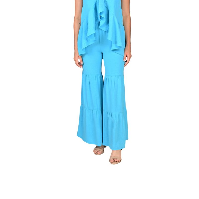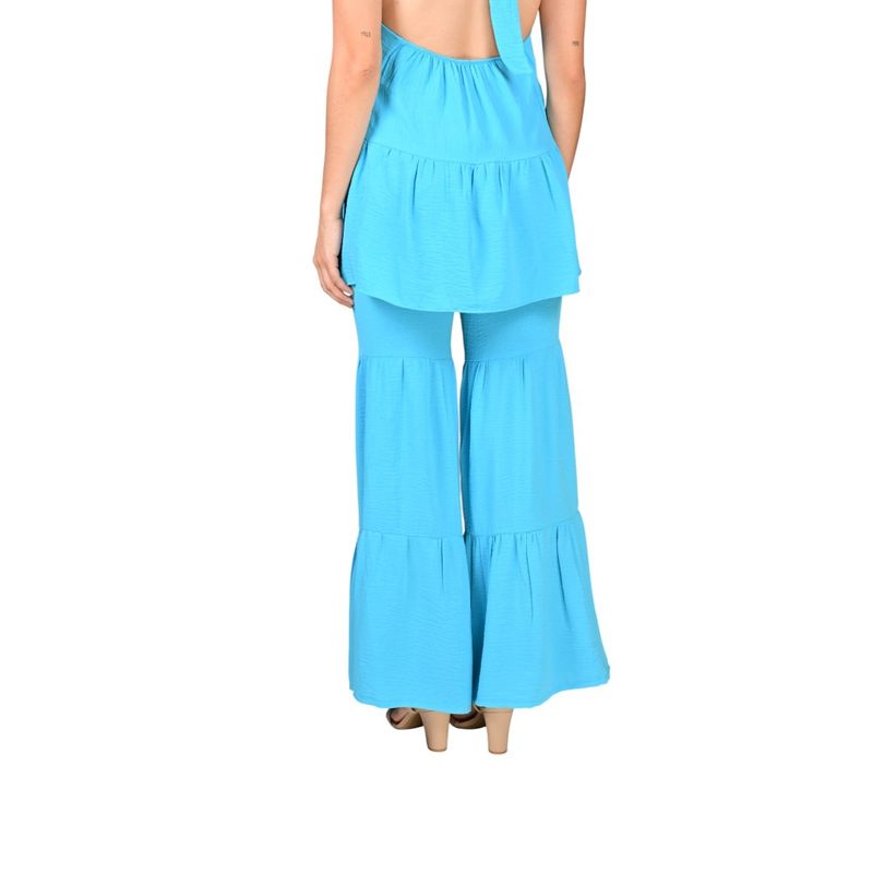 El pantalón palazo en crepe turquesa de L'exclusif combina elegancia y comodidad en una prenda versátil, ideal para quienes buscan un look moderno y sofisticado. Su corte amplio y fluido aporta libertad de movimiento y un estilo refinado, perfecto para diversas ocasiones, desde reuniones sociales hasta eventos informales con estilo.