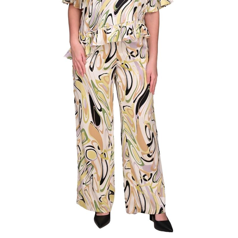 El Pantalón Palazo Estampado Verde Malva Y Gris Mujer L'exclusif es una prenda de estilo fluido y elegante. Su corte holgado de pierna ancha permite que la prenda caiga suavemente hasta el suelo, creando una silueta relajada y sofisticada. El estampado de remolinos abstractos combina tonos suaves de verde malva, amarillo, lila, negro y crema, aportando un detalle visual atractivo y moderno.