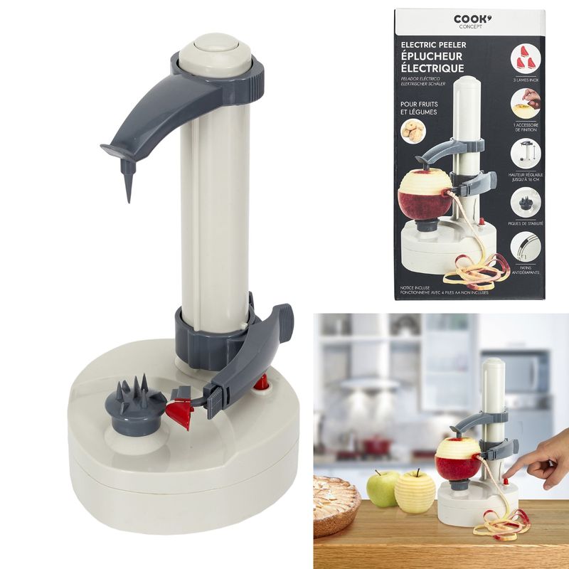 ¡Pelar frutas o verduras es muy fácil con este pelador eléctrico de cook concept! Es muy práctico y es adecuado para casi todas las frutas y verduras de todas las formas (altura ajustable). El pelador eléctrico es muy fácil de usar y funciona con pilas 4XAA (no incluidas). Esto incluye 3 cuchillas de repuesto adicionales. Este pelador tiene almohadillas antideslizantes en la parte inferior para que no se mueva durante el proceso. ¡Ve por la comodidad y elige este pelador eléctrico!
