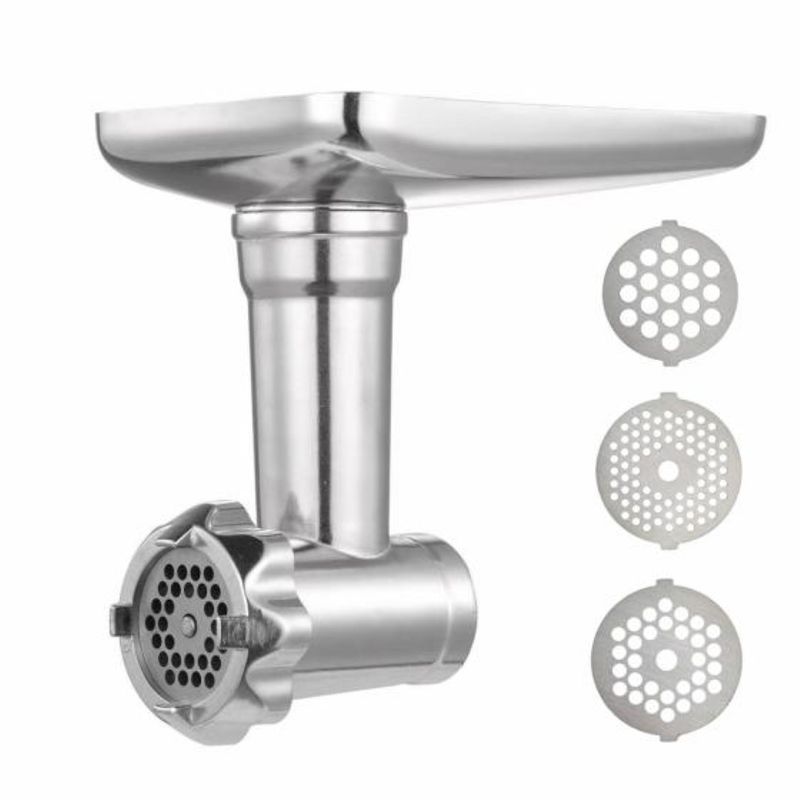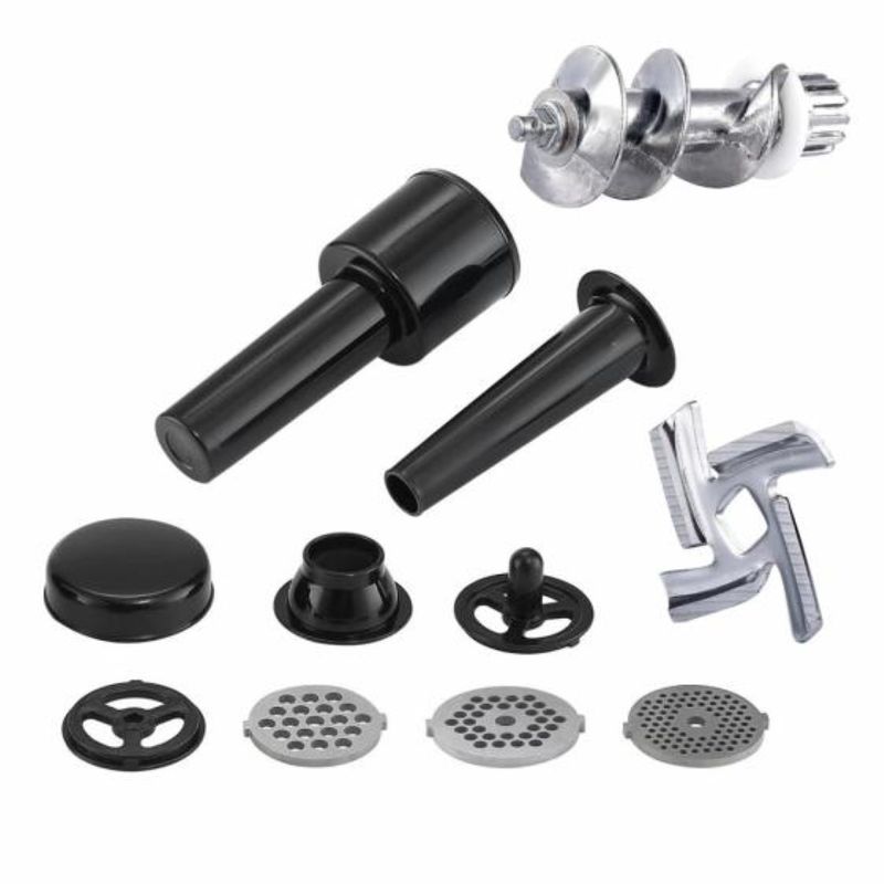 Accesorios incluidos: 3 discos/cuchillas de corte (fina 3mm, media 5mm, gruesa 7mm), accesorios para hacer embutidos (salchicha y kubbe), empujador de alimentos