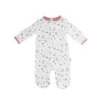 Este pijama para bebé combina ternura y funcionalidad en un diseño pensado para la comodidad de las niñas. Presenta un encantador estampado de casas, nubes, animales y lunas sobre una base blanca, con detalles en tono salmón en puños y cuello que aportan un toque delicado y armonioso. Su diseño incluye pies incorporados y un cierre frontal que facilita el momento de vestir y cambiar al bebé, ofreciendo practicidad y seguridad.