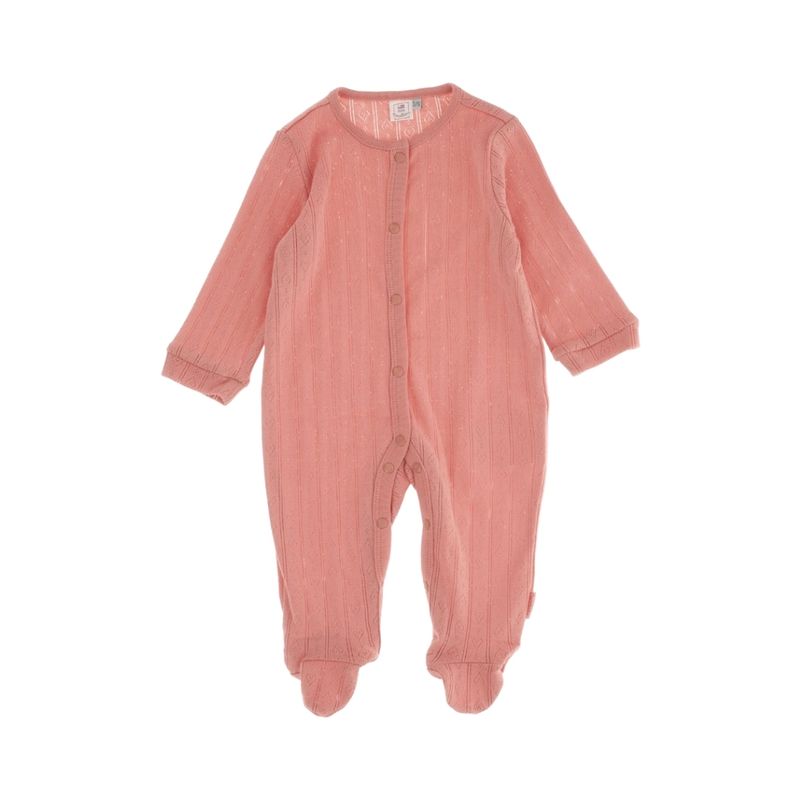 Este pijama de manga larga es ideal para las noches de descanso de tu bebé. Cuenta con pies cubiertos, brindando calidez y protección, y un cierre frontal con botones que facilita el cambio de ropa. Su tejido de punto presenta calados en vertical con un patrón de corazones, agregando un detalle delicado y encantador.
