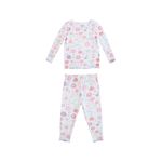 Conjunto de pijama infantil especialmente diseñado para niñas, compuesto por remera de manga corta y pantalón largo en color blanco. Ambas piezas presentan un estampado integral de flores y hojas en tonos pastel, creando un diseño delicado, femenino y visualmente atractivo. Además, las terminaciones con ribetes festoneados de color azul claro aportan un detalle elegante y divertido que realza la estética del conjunto. La remera de manga corta proporciona frescura durante las noches cálidas, mientras que el pantalón largo ofrece abrigo y comodidad en momentos más frescos.