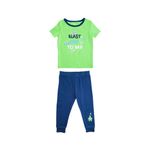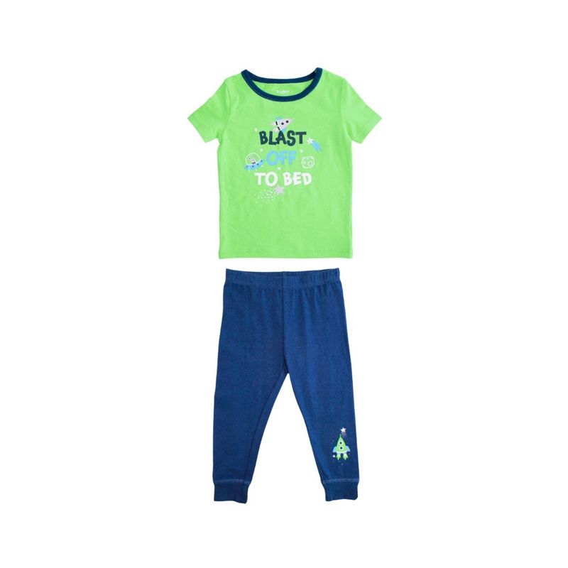 Conjunto de pijama infantil diseñado especialmente para niños, compuesto por remera de manga corta y pantalón a juego. La camiseta, en color verde lima, presenta ribetes en azul marino y un divertido gráfico con la frase “BLAST OFF TO BED” con temática espacial, que inspira aventuras y creatividad durante la hora de descanso. El pantalón azul marino liso incluye un pequeño gráfico de una nave espacial en la parte inferior de la pierna, aportando un detalle original y llamativo. Este conjunto combina frescura y abrigo, ideal para dormir y relajarse en casa con comodidad.