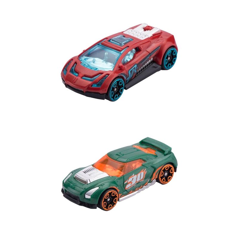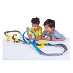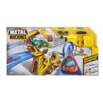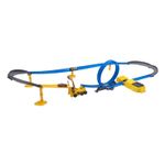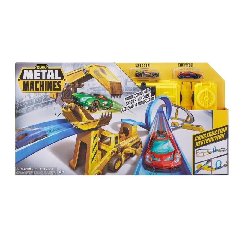 ¡Acelerador de velocidad motorizado que mantiene a tus máquinas de metal corriendo todo el tiempo! ¡2 autos de metal extremadamente rápidas y aerodinámicas! ¡Una máquina de construcción que arroja rocas para sacar a los autos de la pista de carreras! Un bucle y una rampa de acrobacias! Medidas: 60 x 8 x 32 cm.