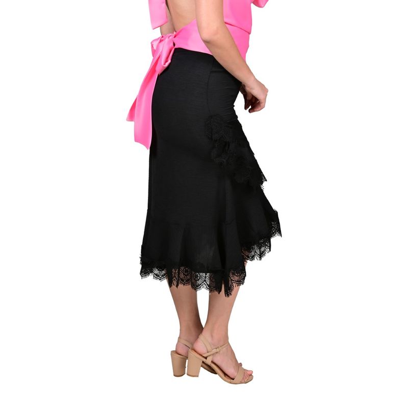 La pollera presenta un corte lápiz entallado que estiliza la silueta, con talle alto que define la cintura y aporta un toque elegante. Su terminación con volantes asimétricos y encaje negro en el bajo agrega dinamismo, feminidad y un detalle artesanal que destaca sobre la clásica estructura del lápiz. La longitud por debajo de la rodilla brinda un look sofisticado y adecuado para eventos formales o reuniones especiales, mientras que el bajo ligeramente irregular aporta un toque moderno y desenfadado.