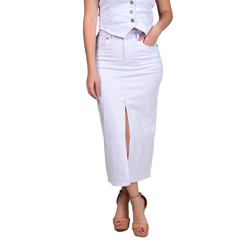 La Pollera Falda Denim Corte Recto Tubo Blanco Mujer Tiare es una prenda elegante y versátil, diseñada para mujeres que buscan un estilo sofisticado sin sacrificar comodidad. Su corte recto y ajustado tipo tubo realza la silueta, mientras que la cintura alta estilo jean proporciona un ajuste favorecedor y contemporáneo. El largo midi, que llega por debajo de la pantorrilla, aporta un toque de elegancia, y la abertura central delantera permite libertad de movimiento y añade un detalle de estilo moderno. Su color blanco neutro facilita combinaciones con diferentes blusas, tops y accesorios, convirtiéndola en una pieza indispensable para cualquier guardarropa femenino.