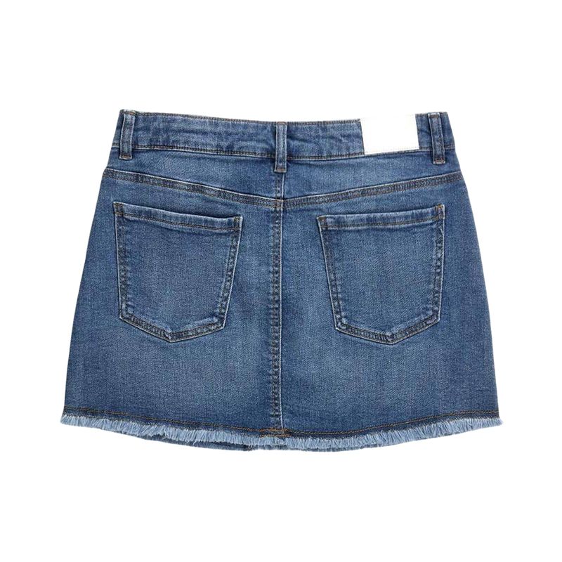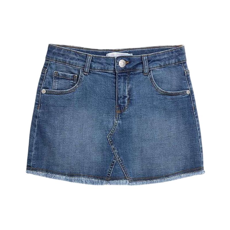 Pollera tipo jeans para niña en color azul medio con efecto desgastado que aporta un look moderno y casual. Cuenta con cinco bolsillos funcionales, cierre frontal de botón y cremallera, y trabillas para cinturón, permitiendo personalizar el ajuste. El bajo deshilachado le brinda un toque actual y juvenil, ideal para combinar con distintas prendas de verano o primavera.