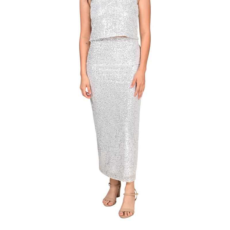 Combínala con blusas lisas de corte clásico o tops ajustados para balancear el brillo de la prenda. Para un look nocturno elegante, se puede complementar con tacones o sandalias de pulsera. También puede combinarse con accesorios discretos para resaltar el detalle de las lentejuelas.