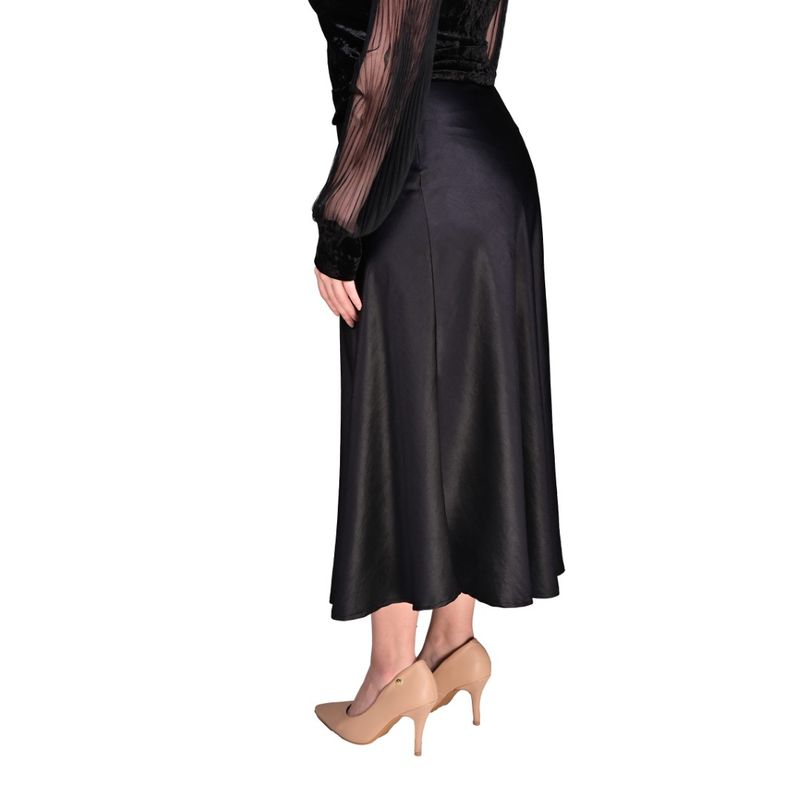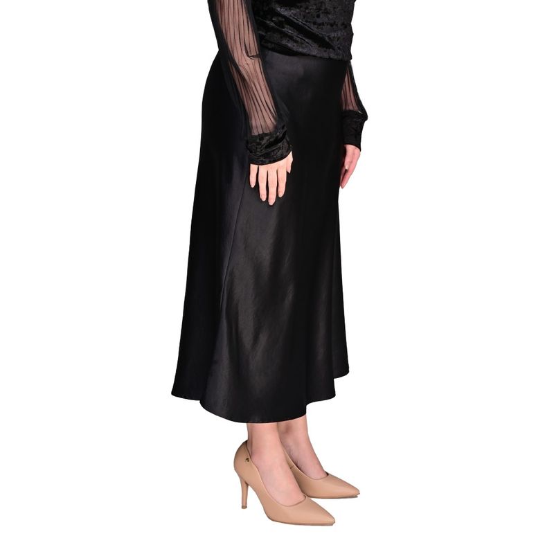 Esta pollera de mujer presenta un elegante corte evasé, que se ajusta suavemente en la cintura y se ensancha gradualmente hacia el dobladillo, creando una silueta fluida y sofisticada. Su diseño al bies permite que la tela caiga de manera natural sobre el cuerpo, aportando movimiento y elegancia en cada paso. El largo midi, que llega hasta la mitad de la pantorrilla, ofrece un equilibrio perfecto entre modernidad y estilo clásico.