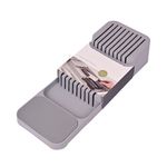 Este porta cubiertos está fabricado en plástico resistente de color gris, con un diseño compacto ideal para cajones de cocina. Presenta una estructura de dos niveles pensada para almacenar cuchillos de manera eficiente: