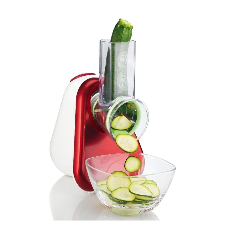 Bonito y compacto, el cortadorrallador Fresh Express es tu nuevo aliado en la cocina y te ayuda a tomar tu ración de verduras diaria. Tiene tres conos que ofrecen 3 tipos de corte diferentes cortar en rodajas, cortar en tiras y rallar, para que puedas preparar divertidas ensaladas. Los ingredientes caen directamente en el plato gracias a su sistema de servicio directo. Además, los conos son apilables y dispone de guardacables, por lo que resulta muy prácti