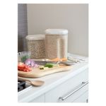 Contenedor hermético con sello y taza medidora ideal para almacenar ingredientes que se utilizan en la repostería y que mantiene el interior alejado de la humedad y olores externos.
