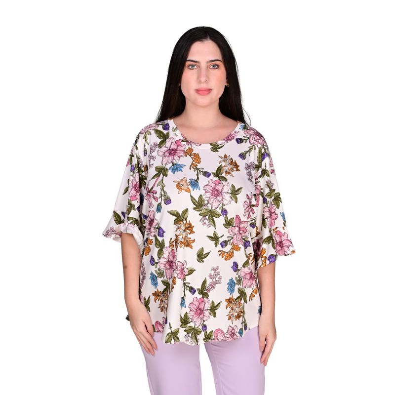 El estampado floral en tonos rosas, morados, azules y verdes sobre una base blanca o marfil proporciona un estilo alegre y primaveral, ideal para looks casuales o románticos. Las mangas de tres cuartos con corte ligeramente acampanado en los puños generan un pequeño volante, sumando un detalle femenino y moderno.
