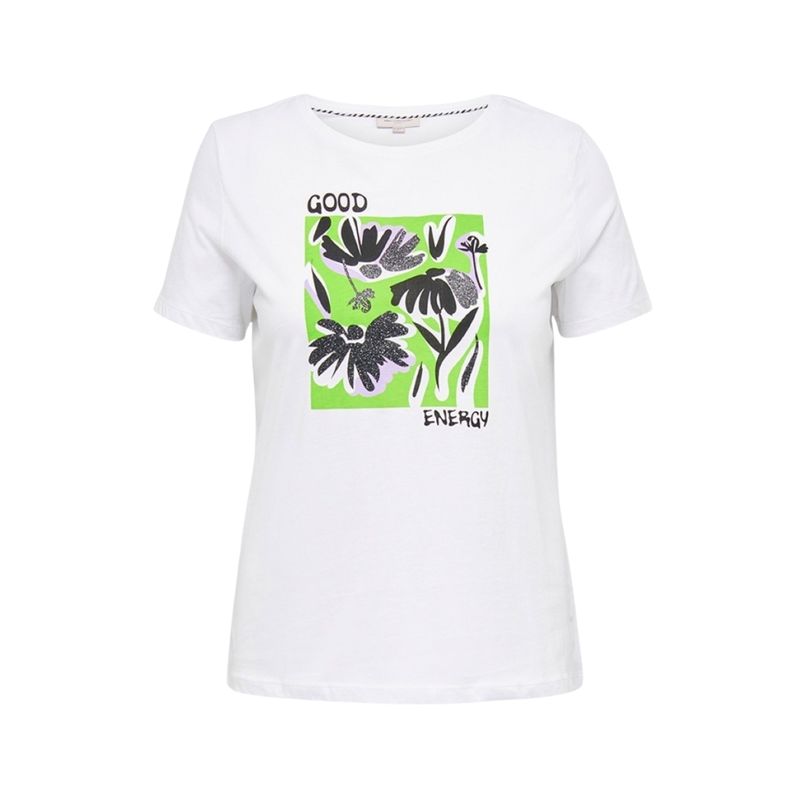 La remera estampada de Carmakoma en color blanco es una prenda fresca y con actitud positiva, ideal para sumar un toque moderno a tus conjuntos diarios. Presenta un diseño de manga corta con un estampado cuadrado en el frente que destaca por su color verde lima, acompañado de ilustraciones florales en tonos negro y malva, junto con la frase "GOOD ENERGY" como mensaje central.
