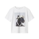 Confeccionada en color blanco y diseñada con cuello redondo y mangas cortas, esta remera destaca por su gran estampado central de una pantera negra, adornada con una corona de flores blancas y púrpuras, y un collar de perlas en el cuello. Un diseño original y llamativo que aporta elegancia y un aire de fantasía al look infantil.