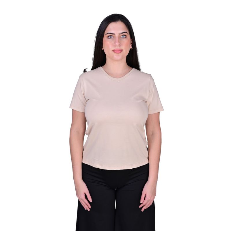 La Remera Básica Cuello V Manga Corta Beige Mujer Tiare es una prenda versátil y atemporal que se adapta fácilmente a diferentes estilos y ocasiones. Su diseño liso en tono beige aporta sobriedad y elegancia, mientras que el corte ajustado y el cuello en V favorecen la figura. Las mangas cortas ofrecen frescura y comodidad, haciéndola ideal para climas cálidos o para usar como capa base en climas más frescos.