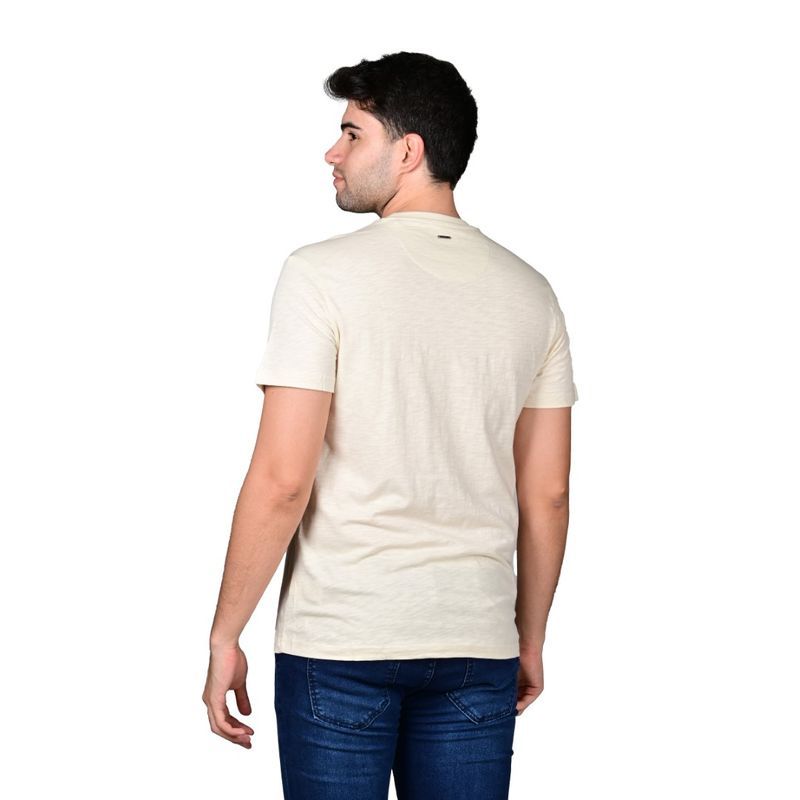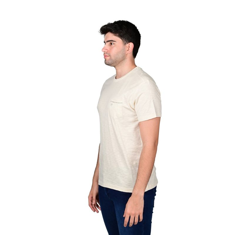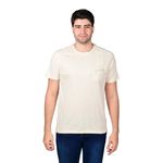 Remera de hombre de manga corta en color beige liso, con un diseño elegante y funcional que incluye un bolsillo lateral. Presenta un cuello redondo clásico y un tejido con textura ligeramente jaspeada que aporta un detalle sutil y moderno, ideal para un look casual y versátil.