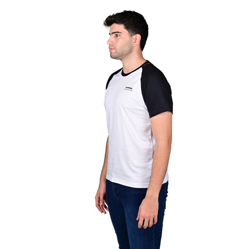 Esta remera raglán para hombre combina estilo deportivo, casual y moderno en un diseño versátil y llamativo. Presenta cuerpo en color blanco y mangas cortas con cuello redondo en azul marino, creando un contraste atractivo que resalta en cualquier look. El pequeño logo o texto discreto en el pecho aporta un detalle sutil que refuerza la identidad de la marca Hummer. Su corte raglán proporciona libertad de movimiento, ideal para actividades cotidianas o deportivas ligeras.