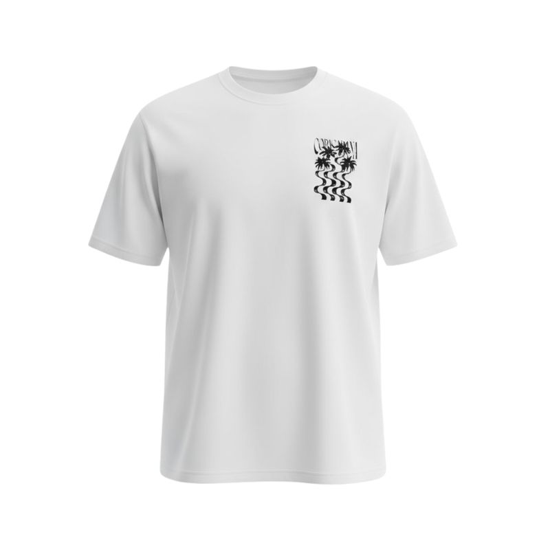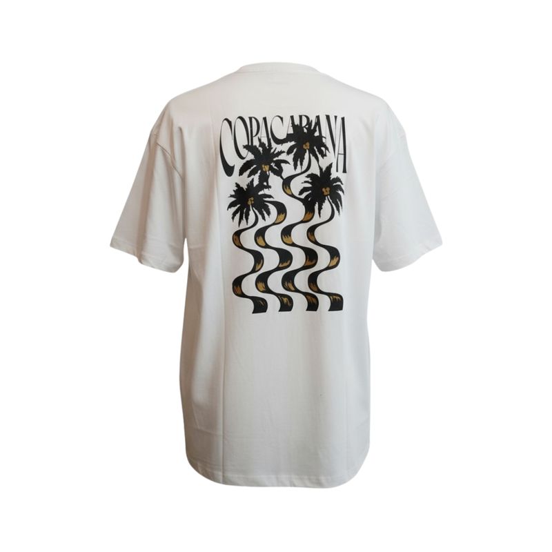 Remera de manga corta para hombre con un diseño oversize que aporta comodidad y un look moderno. Posee un cuello redondo clásico, ideal para combinar con distintos conjuntos casuales. El frente cuenta con un pequeño estampado negro de palmeras y ondas distorsionadas, mientras que la espalda exhibe un diseño más grande con palmeras negras, el texto "COPACABANA" y ondas ondulantes en negro y dorado, ofreciendo un detalle visual atractivo y veraniego.
