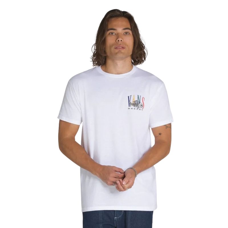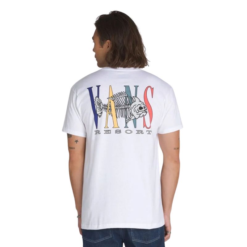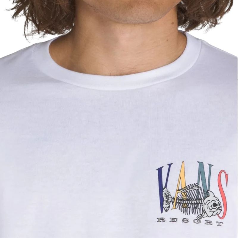 La Remera Manga Corta Blanco Resort Hombre Vans es una prenda imprescindible para quienes buscan un estilo urbano y moderno con un toque creativo. Su diseño incluye un logotipo Vans® estampado en el pecho izquierdo, mientras que en la espalda presenta un llamativo diseño de esqueleto de pez enredado en el logotipo, ofreciendo un detalle único que destaca en cualquier ocasión. El ajuste clásico de la prenda proporciona una sensación natural y relajada, ideal para el uso diario y actividades casuales.