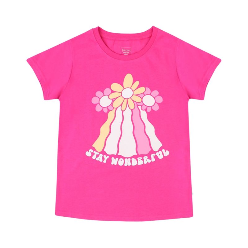 Descubre la Remera Manga Corta Power Light de Ficcus, diseñada especialmente para niñas que buscan un look urbano, moderno y divertido. Su cuello redondo clásico aporta comodidad y facilita el uso diario, mientras que su diseño único combina un estampado floral psicodélico con la frase motivadora "STAY WONDERFUL", creando un detalle visual atractivo y positivo. Lo más sorprendente es que los colores del estampado cambian notablemente al exponerse a la luz solar, ofreciendo un efecto dinámico y llamativo que hará que tu hija destaque en cualquier ocasión.