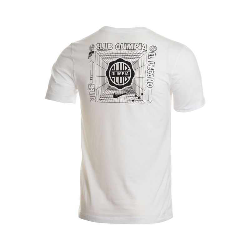 La parte trasera destaca por un diseño gráfico exclusivo: un estampado en negro con el escudo del Club Olimpia al centro, acompañado por elementos geométricos y textos como “Club Olimpia”, “El Decano” y “Nike”, aportando un toque moderno y distintivo a la prenda.