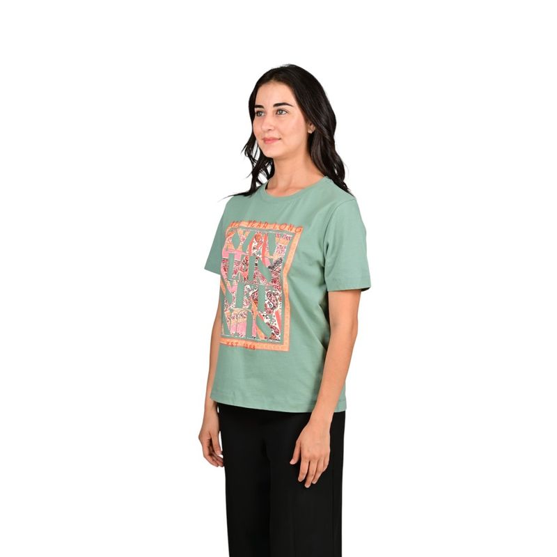 Se puede combinar con shorts de tela, faldas cortas o polleras para lograr un outfit fresco y relajado. También acompaña muy bien looks casuales con pantalones de tela de corte recto o amplio. Para completar el conjunto, se puede optar por champion en propuestas informales o calzados cerrados de estilo urbano. Los accesorios simples y prácticos ayudan a realzar el estampado sin recargar el look.