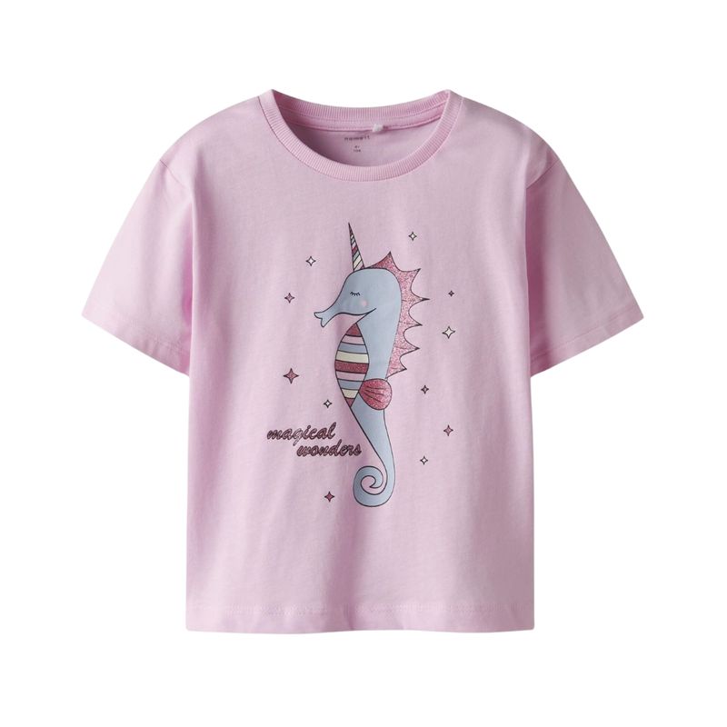 Ofrecé a tu niña una prenda casual y femenina con esta remera manga corta de Nameit en color rosa, que presenta un encantador diseño inspirado en criaturas marinas y temáticas de fantasía. Ideal para niñas que disfrutan de prendas con un toque mágico y original.