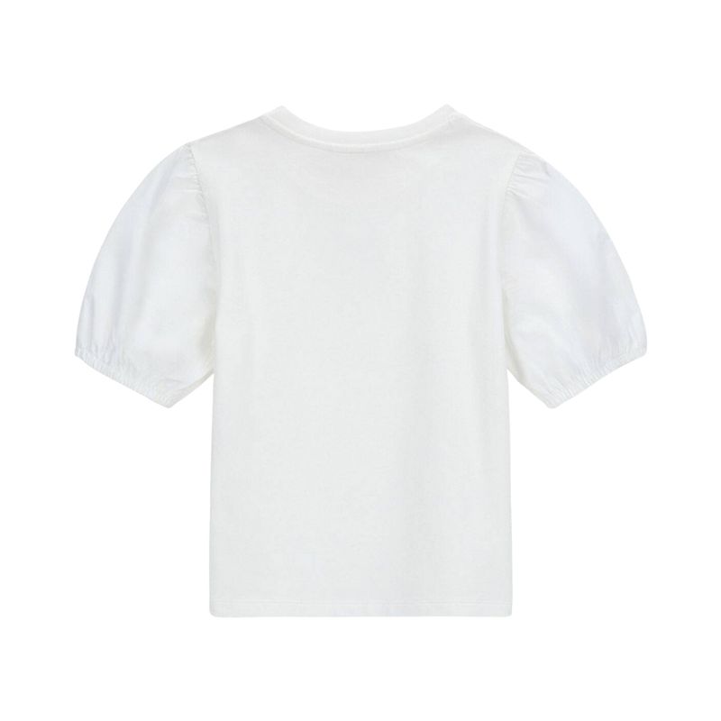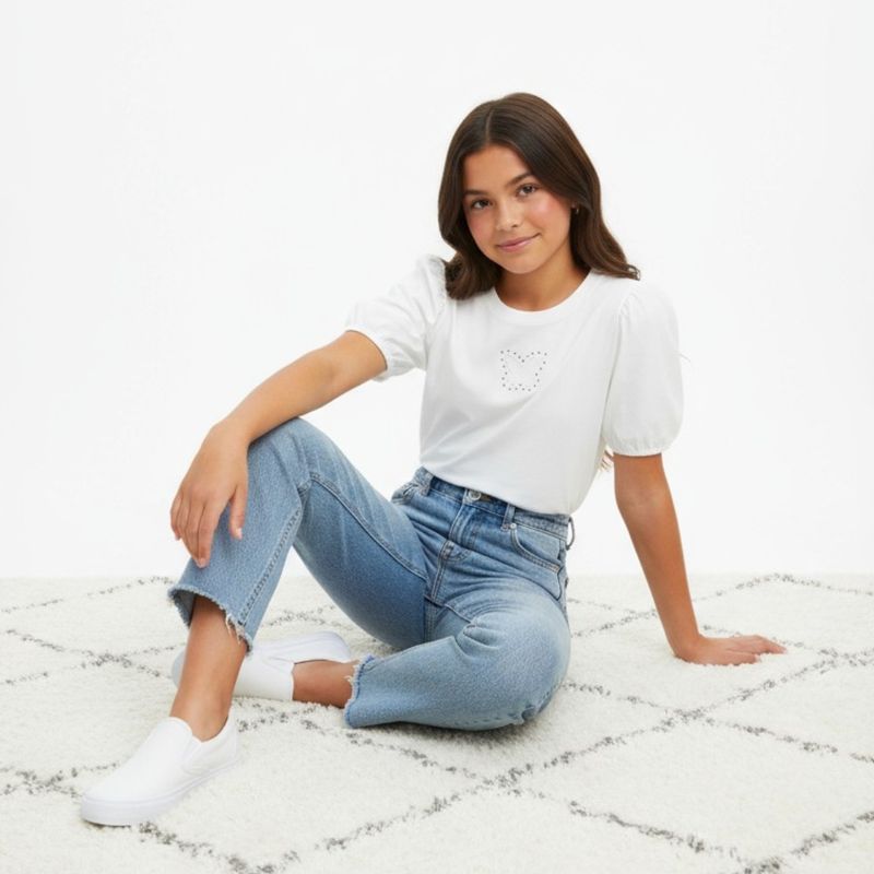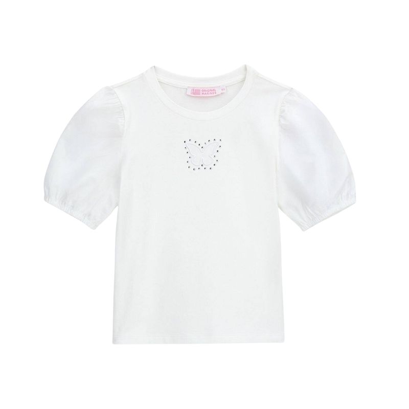 Remera de manga corta para niña con diseño elegante y delicado, en color blanco clásico. Destacan sus mangas abullonadas tipo globo, ligeramente fruncidas, que aportan un toque moderno y femenino a la prenda. El detalle central consiste en un aplique de mariposa blanca, finamente cosido con pequeños bordados negros que añaden textura y sofisticación al look.