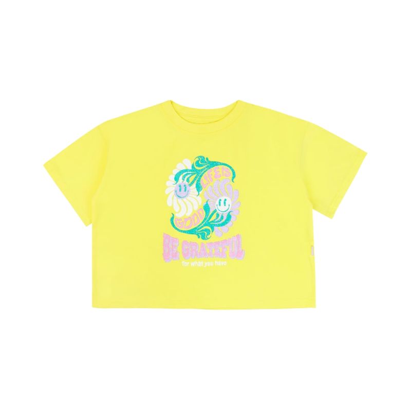 La Remera Manga Corta Day To Day de Ficcus es una prenda urbana diseñada para niñas, que combina comodidad y diversión en el día a día. Destaca por su estampado frontal brillante con efecto glitter, que presenta dos flores sonrientes y la frase “BE GRATEFUL for what you have” en tonos pastel y fucsia, transmitiendo un mensaje positivo y alegre. Su color amarillo vibrante y las mangas cortas le dan un toque fresco y moderno.