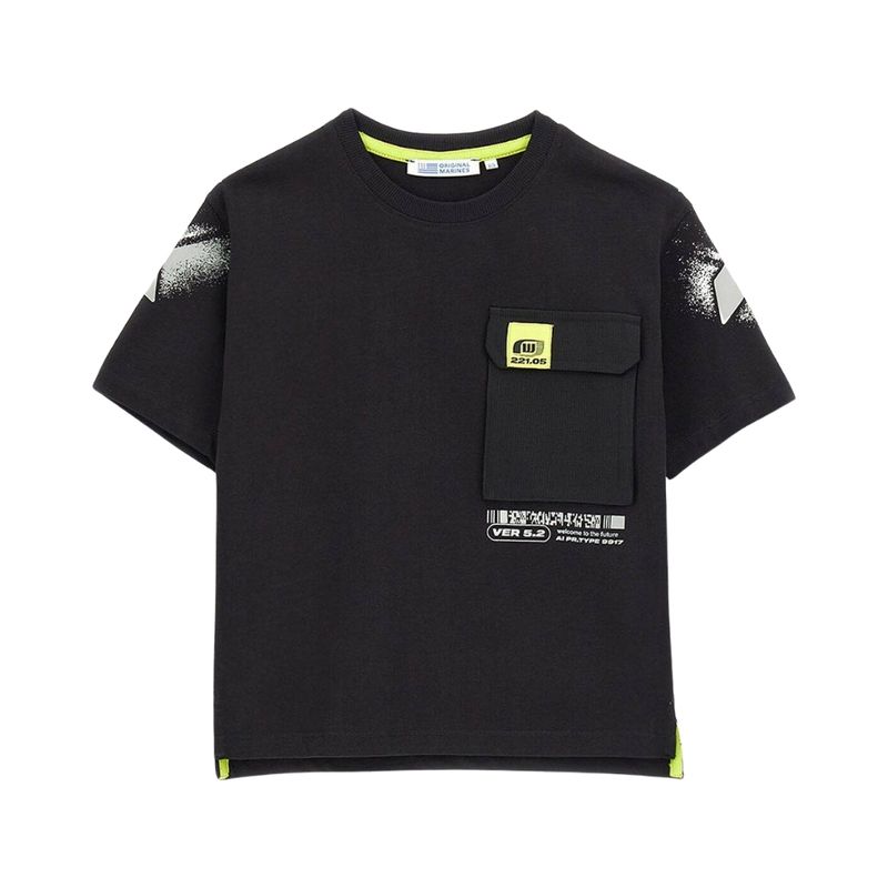 La Remera Manga Corta Digital Con Bolsillo Negro Niño Original Marines combina funcionalidad y estilo moderno, perfecta para el día a día de los niños, ofreciendo comodidad y un look urbano con inspiración ciberpunk.