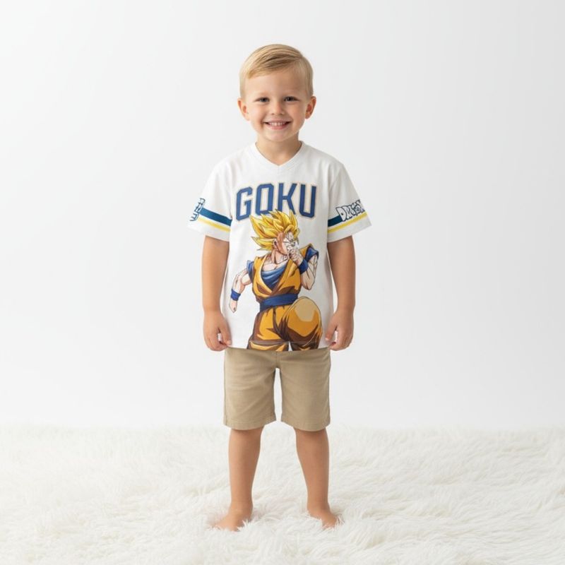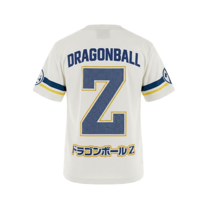 • Bandas azules y amarillas con texto "DRAGON BALL" en las mangas estilo beisbolero.