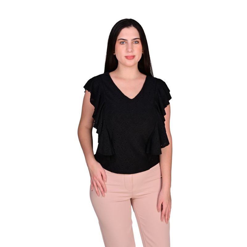 Esta remera de mujer destaca por su elegancia y estilo delicado, ideal para quienes buscan prendas femeninas y versátiles. Presenta un escote en V pronunciado que realza la zona del busto y agrega un toque de sofisticación. Su corte en A permite un ajuste cómodo en el torso mientras fluye suavemente hacia la cadera, brindando una silueta favorecedora. Los dos volantes en cascada que cubren la parte delantera y trasera aportan movimiento y un estilo romántico, mientras que el tejido de broderie inglés con pequeños orificios decorativos en toda la superficie añade textura y un detalle visual único.
