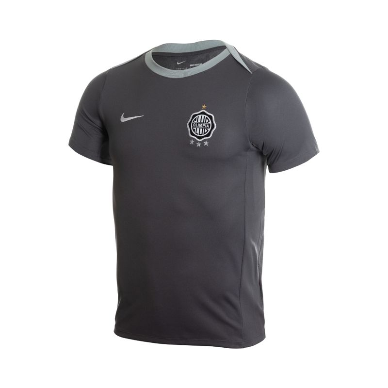 Su estética predominante en gris oscuro se complementa con detalles en gris claro en el cuello y la zona superior de la espalda, creando un contraste elegante y profesional. En el pecho se luce el escudo oficial del Club Olimpia acompañado por la estrella dorada y las tres estrellas plateadas que simbolizan los mayores logros internacionales del club. El logo del patrocinador técnico, en tono claro, aporta discreción y armonía al diseño general.
