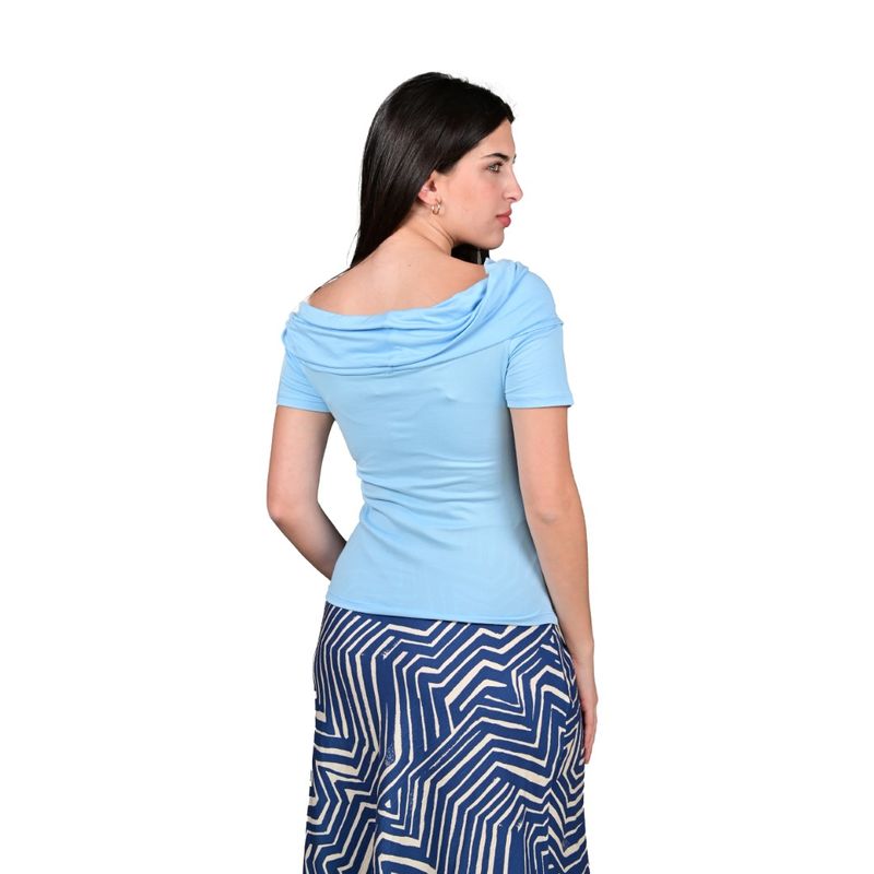 Mujeres que buscan una prenda femenina, elegante y cómoda, perfecta para salidas casuales, reuniones informales, paseos de día o combinaciones creativas donde el escote Bardot se destaque. Su diseño celeste y drapeado aporta frescura y luminosidad al look, convirtiéndola en una pieza imprescindible dentro del guardarropa de verano.