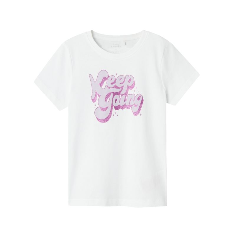Esta remera manga corta para niña de la marca Nameit presenta un diseño fresco y motivador con un estampado alegre de estética retro y acabado brillante, que resalta sobre el fondo blanco de la prenda. Es ideal para niñas que buscan una combinación de estilo clásico con un toque divertido y optimista.