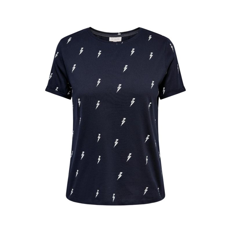 La remera manga corta estampada para mujer de Carmakoma en color azul marino es una prenda moderna y vibrante que aporta energía y estilo a cualquier conjunto. Su diseño destaca por el estampado repetido de relámpagos blancos, que le da un carácter dinámico y actual, ideal para quienes buscan un look fresco y llamativo.