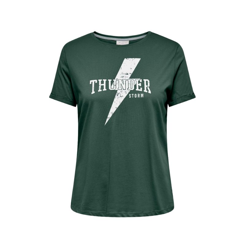 La remera manga corta para mujer de Carmakoma en color verde oscuro presenta un diseño moderno y audaz, con un estampado blanco que incluye un rayo y la palabra "THUNDERSTORM". Esta prenda es perfecta para quienes desean expresar personalidad y energía a través de su vestimenta, combinando estilo y comodidad en una sola pieza.