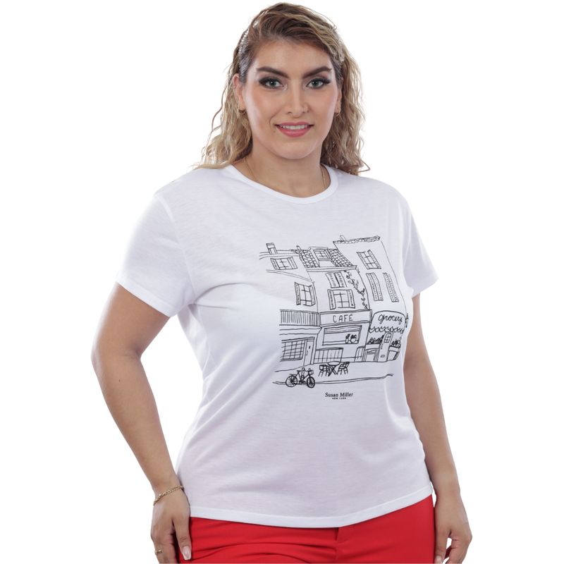 La Remera Manga Corta Estampado Ciudad Blanco Mujer Susan Miller combina frescura, comodidad y un estilo urbano moderno que la convierte en una pieza clave para tu guardarropa. Su diseño destaca por un estampado frontal artístico que representa una calle con un café, una tienda de comestibles y una bicicleta, aportando un aire dinámico, juvenil y con personalidad.
